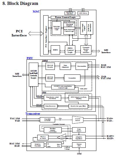 Features: (1)100 pin OFP/LQFP; (2)integrated fast ethernet MAC, physucal chip and transceiver in one chip; (3)10 Mb/s and 100 Mb/s operation; (4)supports 10 Mb/s and 100 Mb/s N-way auto-negotiation operation; (5)Support 25MHz cystal or 25MHz OSC as the internal clock source. The frequency deviation of either crystal or OSC must be within 50 PPM.